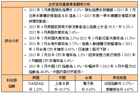 2015年3月美国领先指标升0.2%,低于预期;2015年3月北美半导体设备制造B/B值为1.1,半导体景气热;2015年4月美国密西根大学消费者信心指数上升至95.9,较2015年3月上升;2015年4月美国失业率为5.4%,降至近7年最低;2015年3月英国失业率为2.3%;2015年3月欧元区失业率为11.3%;2015年3月台湾失业率为3.72%;2015年3月台湾CPI年增率-0.61%;2015年3月中国CPI指数为1.4%,升幅持平;2015年4月中国PMI指数为48.9%,下调0.3%。