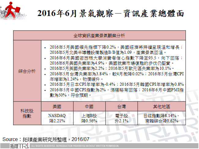 2016年5月美国领先指标下降0.2%,向下回落;2016年5月北美半导体设备制造B/B值为1.09,较4月滑落;2016年6月美国密西根大学消费者信心指数下降至93.5,略低于预期;2016年6月美国失业率为4.9%,较5月上升0.2%;2016年5月英国失业率为2.2%;2016年5月欧元区失业率为10.1%;2016年5月台湾失业率为3.84%;2016年5月台湾CPI年增率为1.24%;2016年5月中国CPI指数为2%,较4月下滑;2016年6月中国PMI指数为50%,较5月微降0.1%。