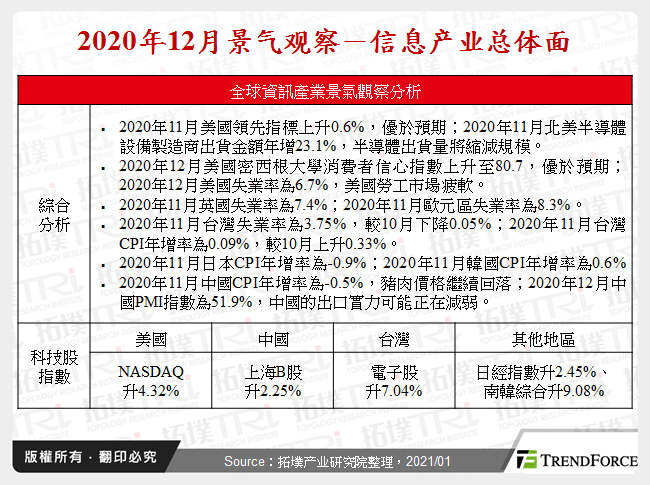 2020年11月美国领先指标上升0.6%,呈现上扬;2020年11月北美半导体设备制造商出货金额年增23.1%,半导体仍表现强劲;2020年12月美国密西根大学消费者信心指数上升至80.7,美国消費動 [...]
